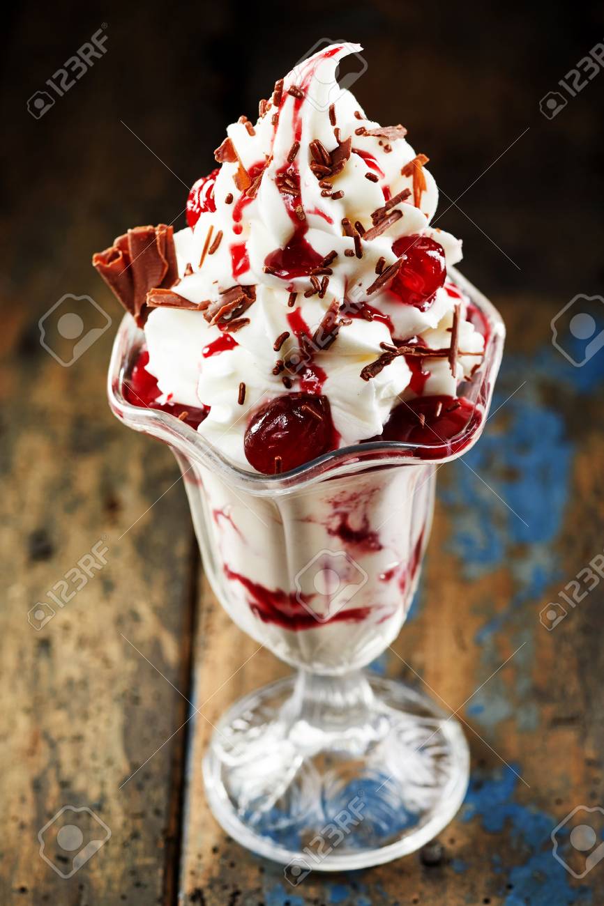 Tasty Vanilla Ice Cream With Maraschino Cherries And Fruit Syrup
